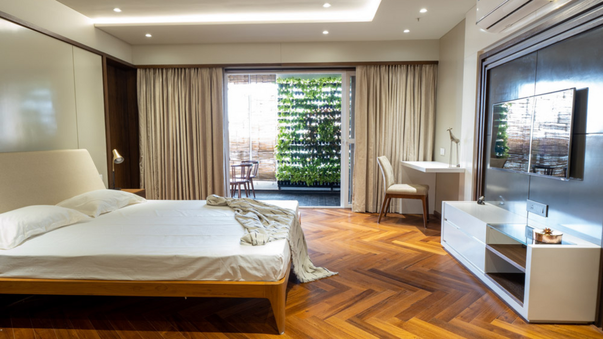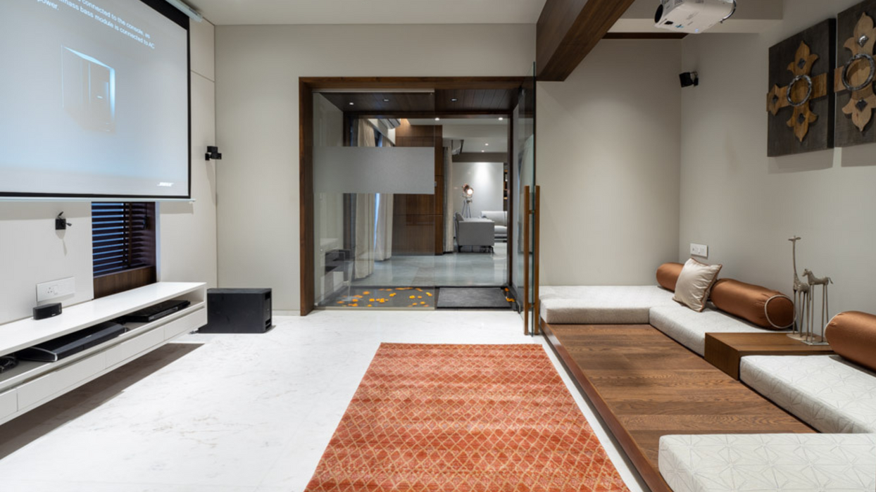 When the client initially approached us, the goal was to merge two adjacent residential units to create a spacious home entirely based on Vastu principles. The client's preference for Indian architectural aesthetics further motivated us to incorporate vernacular elements into every space while avoiding unnecessary panelling and decoration. To highlight the original architectural structure of the space, a neutral colour palette flows throughout the home, with dominant wood furniture complemented by metal accents and vibrant colours in furnishings.